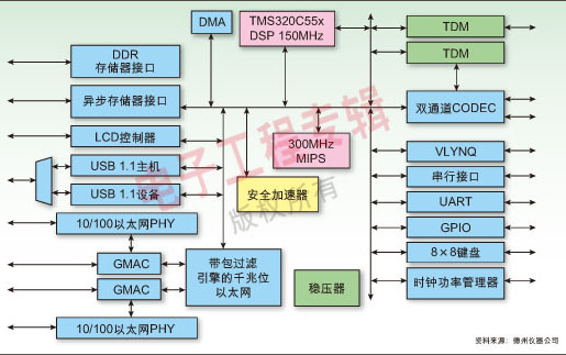 德州儀器(TI)公司最新的VoIP處理器設(shè)計(jì)用于確保在中小企業(yè)應(yīng)用中提供無(wú)延遲的語(yǔ)音服務(wù)。這種名為T(mén)NETV1051的處理器集成了1個(gè)300MHz的MIPS處理器、1個(gè)150MHz的C55x數(shù)字信號(hào)處理器(DSP)、2個(gè)千兆位以太網(wǎng)(GbE)媒體訪問(wèn)控制器(MAC),以及1個(gè)片內(nèi)GbE交換器。