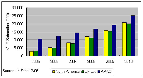 應該說在2006年,VoIP技術已經不是阻礙其市場發(fā)展的主要因素,因為In-Stat在全球個人VoIP消費市場中作的調查顯示,約9%的VoIP用戶甚至不清楚自己在使用IP傳輸;有64%的用戶在使用免費的VoIP服務。其次有超過73%的用戶并不把是否使用IP技術當成選擇該業(yè)務的影響因素。而寬帶接入市場的競爭則構成了VoIP發(fā)展的關鍵因素,作為一種寬帶應用,誰的接入資源占據(jù)了用戶家庭,誰就可以決定是否采用VoIP技術來提供語音業(yè)務。在歐洲法國Free Telecom與意大利的FastWeb都是三重播放業(yè)務的積極推進者,在VoIP市場居領先地位;在日本Yahoo!BB擁有亞洲地區(qū)50%的寬帶VoIP用戶。幾乎所有這些寬帶ISP提供商往往采用包月的形式或者以極低的費用提供無限制的本地或國內通話,在國際長途電話上提供極大的折扣。圖 全球VoIP用戶預測