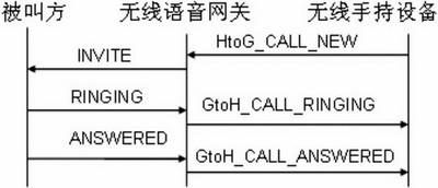 當用戶通過無線手持設(shè)備撥打一個號碼時,無線手持設(shè)備將發(fā)送一個HtoG_CALL_ NEW的內(nèi)部會話信令連同呼叫的號碼給無線語音網(wǎng)關(guān),無線語音網(wǎng)關(guān)收到該信令后,將根據(jù)該信令構(gòu)造相應(yīng)的SIP消息并發(fā)送到外部網(wǎng)絡(luò)。當無線語音網(wǎng)關(guān)收到來自被叫方表示振鈴信息的暫時應(yīng)答RINGING時,將發(fā)送一個GtoH_CALL_RINGING的內(nèi)部會話信令給手持設(shè)備。當無線語音網(wǎng)關(guān)收到來自被叫方表示應(yīng)答的信息ANSWERED時,語音網(wǎng)關(guān)將啟動RTP線程并發(fā)送一個GtoH_CALL_ANSWERED的內(nèi)部會話信令給手持設(shè)備以通知被叫方已應(yīng)答。此時手持設(shè)備開啟語音進程,與被叫方實現(xiàn)通話。