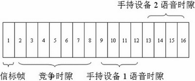 根據(jù)設(shè)計的特點,無線語音網(wǎng)關(guān)同手持設(shè)備間的無線網(wǎng)絡(luò)采用星型拓撲結(jié)構(gòu),無線語音網(wǎng)關(guān)作為無線個域網(wǎng)的協(xié)調(diào)器同手持設(shè)備進行信息交互。IEEE802.15.4MAC層分為使用信標幀和不使用信標幀兩種工作模式,本設(shè)計采用使用信標幀同步的超幀結(jié)構(gòu),由無線語音網(wǎng)關(guān)發(fā)送信標幀同步無線手持設(shè)備的數(shù)據(jù)傳輸。本設(shè)計中超幀長30ms,等分為16個時隙,每個時隙為1.875ms。信標幀在時隙1發(fā)送,時隙2到時隙8為競爭時隙,使用時隙CSMA-CA算法傳輸命令幀和應(yīng)答幀。時隙9到時隙16固定分配給兩個手持設(shè)備作為上下行語音數(shù)據(jù)通道。上下行各兩個時隙的分配可以滿足經(jīng)