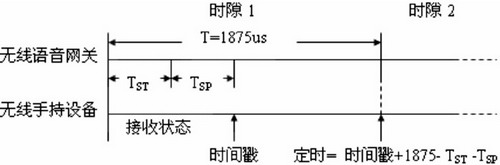 時隙1開始后,語音網(wǎng)關(guān)需要TSTms的時間將射頻芯片從空閑狀態(tài)轉(zhuǎn)換為發(fā)送狀態(tài),當轉(zhuǎn)換為發(fā)送狀態(tài)后,預(yù)先存儲在射頻芯片發(fā)送RAM中的信標幀立即開始發(fā)送,手持設(shè)備上的射頻芯片在收到六個字節(jié)TSPms后自動鎖存一個當前時間timestamp(時間戳),