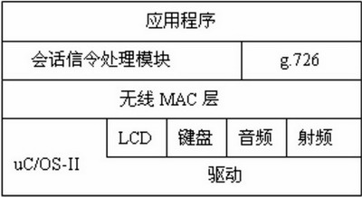 操作系統(tǒng)之上是無線MAC層,該模塊針對語音無線傳輸?shù)奶攸c簡化實現(xiàn)了IEEE 802.15.4 協(xié)議MAC層功能。第三層為語音壓縮編解碼g.726模塊和無線網(wǎng)內(nèi)部會話信令處理模塊。會話信令處理模塊負責處理來自無線語音網(wǎng)關(guān)的會話信令。最上層為應(yīng)用層,實現(xiàn)用戶界面和通話過程控制。無線手持設(shè)備總統(tǒng)框架如圖6所示。