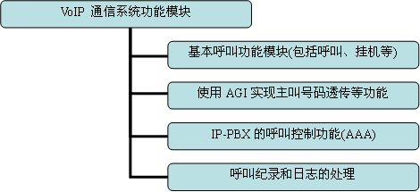 如果是基于純軟件的實現(xiàn)方案,Asterisk是構(gòu)建VoIP項目的核心,系統(tǒng)中所有與用戶呼叫有關(guān)的功能和管理都通過它來實現(xiàn),包括VoIP各種協(xié)議的互通和配置,以及各種呼叫設(shè)備的配置文件。本文檔所討論的VoIP通信系統(tǒng)基本功能如圖3-2所示,一般的Asterisk的任務(wù)包括了兩方面,一是與呼叫有關(guān)的,包括基本呼叫處理、主叫號碼透傳、呼叫紀(jì)錄和日志生成等,二是與呼叫控制有關(guān),即終端用戶的認(rèn)證計費功能。
