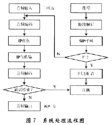當(dāng)撥號確認后,主控制器對編解碼器發(fā)送控制指令,開始語音A/D轉(zhuǎn)換,并進行編碼,送到片外存儲器內(nèi)進行緩存;Nios CPU對撥號信息的解析確定。目的地址,通過Avalon總線對以太網(wǎng)接口發(fā)送數(shù)據(jù)傳輸指令;將符合以太網(wǎng)標準的數(shù)據(jù)從片外存儲器內(nèi)讀出,送入Internet中,返回確認信息。系統(tǒng)處理流程圖如圖7所示。