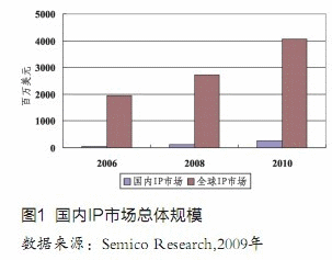 中國是全球最大的半導體市場之一,但是相對應(yīng)的中國集成電路IP(知識產(chǎn)權(quán))市場只有5610萬美元,僅為全球市場的2.8%,仍屬于起步階段。根據(jù)Semico Research的分析,到2010年中國IP市場將增長到2.47億美元,占全球市場的6%,年均增長率高達44.9%,遠超過全球IP市場的18.3%的增長率(見圖1)。