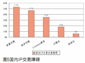 根據(jù)我們對92家芯片設(shè)計企業(yè)的問卷調(diào)查,IP質(zhì)量、IP保護和IP費用是目前國內(nèi)IP核交易中的主要障礙。(見圖5)