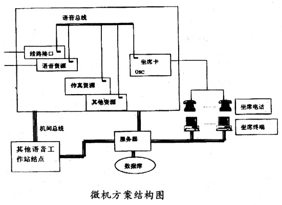 ____這種方案以近幾年發(fā)展迅速的微機語音處理技術(shù)為基礎(chǔ),其基本思想是在微機平臺上 集成各種功能的語音處理卡,完成通信接口、語音處理、傳真處理、坐席轉(zhuǎn)接等功能,再 結(jié)合外部的計算機網(wǎng)絡(luò)實現(xiàn)各種應(yīng)用系統(tǒng)的需求。