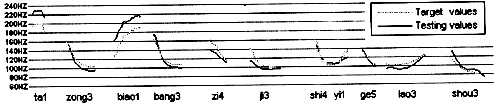 韻律模型的基頻輸出基本反應(yīng)了漢語語句的韻律特征。由圖4可以看出,其基頻參數(shù)的測試結(jié)果與真實(shí)的基頻參數(shù)比較接近,基頻變化過程基本保持了陳述語氣的下傾趨勢,同時它還反映出了發(fā)音過程的韻律塊特性。如圖中陳述句“他總標(biāo)榜自己是一個老手”,受發(fā)音停頓的影響,“是”作為一個韻律短語的開頭,其基頻和音域變得相對較高。另外,神經(jīng)網(wǎng)絡(luò)韻律模型還能很好地反映上聲變調(diào)的現(xiàn)象。如“老手”中的“老”字,受后音的影響,由上聲變?yōu)榱岁柶健?/font>