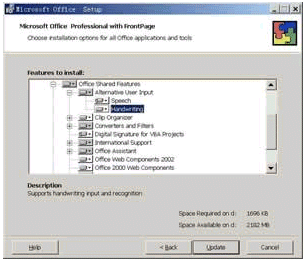 如果是首次使用手寫(xiě)識(shí)別,那么需要通過(guò)執(zhí)行自定義安裝來(lái)安裝本功能。注意無(wú)法從"工具"中找到類(lèi)似"語(yǔ)音"的"手寫(xiě)"命令,你只能通過(guò)插入Office XP光盤(pán)的方法進(jìn)行自定義安裝,其安裝步驟與安裝自定義安裝語(yǔ)音識(shí)別功能一致,不過(guò)這次是從"Office 共享功能"旁,單擊"中文可選用戶(hù)輸入方式"旁,單擊"手寫(xiě)輸入"(如圖15所示)。