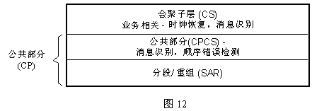 ATM適配層,是ATM核心(包括ATM層和物理層,與業(yè)務(wù)無(wú)關(guān))和高層間的接口(見圖5),它是為使ATM層能適應(yīng)不同業(yè)務(wù)類型而設(shè)置的,故ATM對(duì)各種業(yè)務(wù)承載能力集中體現(xiàn)在ATM適配層。ATM適配層又細(xì)分為若干子層。具體如下圖12。
