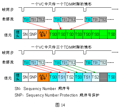 在同一個(gè)虛通道(VC)中,AAL1還支持一個(gè)或多個(gè)DS0(64Kbps)。當(dāng)虛通道中只有一個(gè)DS0話音時(shí),可以使用無(wú)結(jié)構(gòu)數(shù)據(jù)格式(UDF:Unstructured Data Format)傳送,這是一種面向比特的技術(shù);當(dāng)有多個(gè)DS0同時(shí)傳送時(shí),必須使用結(jié)構(gòu)化數(shù)據(jù)格式(SDF:Structured Data Format),此時(shí)各DS0數(shù)據(jù)流按字節(jié)依次傳送,即是面向字節(jié)的。這兩種格式的區(qū)別如下圖13所示。其中AAL1指針用于指示多DS0時(shí),第一個(gè)DS0字節(jié)位置,以便定時(shí)。利用AAL1可以實(shí)現(xiàn)ATM對(duì)STM(TDM)信號(hào)的傳送,見圖14。