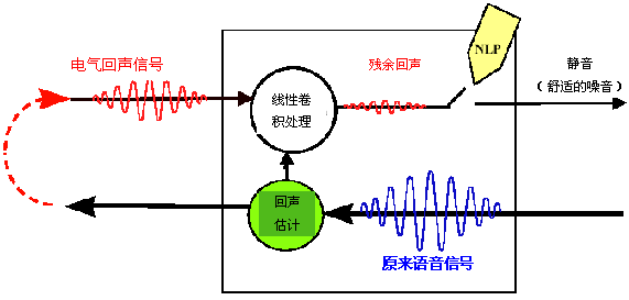 符合ITU G.168(2000)標(biāo)準(zhǔn)的回聲消除器能夠消除電氣(混合)回聲。這類設(shè)備在其運(yùn)行當(dāng)中采用了"兩段式"方法。在第1階段,使用線性卷積處理消除了大部分回聲。在第2階段,采用了非線性處理器(NLP)以消除殘存的回聲,這一部分相對(duì)較小。對(duì)殘存回聲信號(hào)的辨識(shí)是一件很簡單的任務(wù),這是因?yàn)樗墓β孰娖矫黠@低于原始的語音信號(hào)。