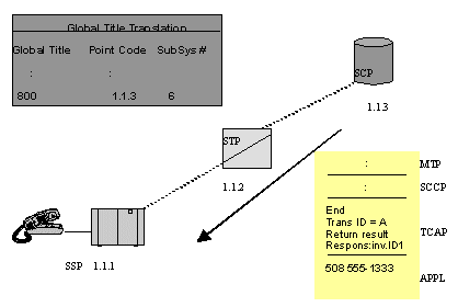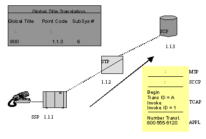 主叫用戶拔叫800用戶號(hào),這就觸發(fā)位于交換局(圖中SSP)內(nèi)的路由應(yīng)用程序發(fā)出一個(gè)TCAP查詢。圖中的STP收到查詢,用MTP層和SCCP層協(xié)議轉(zhuǎn)發(fā)查詢到SCP的800號(hào)碼數(shù)據(jù)庫(kù)。這樣,SSP中的應(yīng)用程序就和SCP直接建立了對(duì)話。