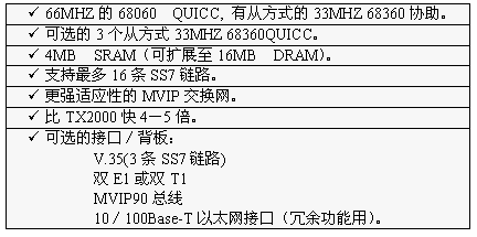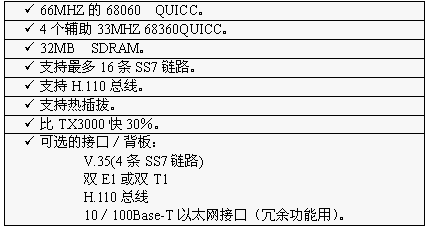 TX3000卡的功能大致和TX2000卡相同,但它比TX2000的性能2.5至5倍。TX3000卡上有一個66MHZ的68060協(xié)處理器。TX3000卡為SS7應用配置1至4個QUICC通信控制器,最多16條信令鏈路,提供一個三口V.35,擁有雙T1或雙E1接口。(主板上標準配置一個QUICC,支持四條SS7鏈路,當CT總線和串行接口都要使用,或者處理的鏈路超過4條時,可先配置有三個QUICC的背板,四個QUICC可支持16條SS7鏈路)。