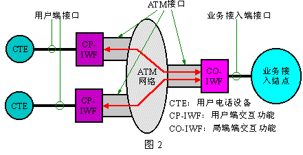 下圖2是VoATM的參考模型。其中的CTE為用戶電話終端設備,“業(yè)務接入結點”是指用戶電話業(yè)務的提供網絡在ATM網絡側的界;其中的CP-IWF完成用戶電路和ATM網絡的協作功能,而CO-IWF則完成ATM網絡和業(yè)務網絡的協作功能。