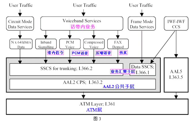 下圖3給出了VoATM的協議結構模型(來源:AF-VMOA-0145-000:ATM論壇ATM Forum)。這是一個基于AAL2進行話帶話音及多媒體業(yè)務傳送的協議框架。在ATM論壇標準中,被稱為環(huán)路仿真業(yè)務(LES:Loop Emulation Service),和傳統(tǒng)PSTN不同的是采用很大新技術以充分利用傳送帶寬: