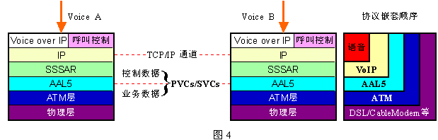 除了上面的LES外,還可以通過AAL5進行話音傳送。下圖4為其協議模型。實質上這是通過兩次映射完成的:首先進行的是VoIP技術,之后把這些語聲IP包通過IPoATM(LANE)傳送?雌饋硭坪踹^于羅嗦,但這樣做的目的是充分利用VoIP技術的靈活性和AAL5的優(yōu)點(開銷小、糾錯強,支持多種業(yè)務速率/變速率),也即,它必須建立在ATM網絡的高可靠性和VoIP的充分成熟基礎之上;就目前的技術發(fā)展而言,這兩個條件都已具備了。圖4中的右邊給出了基于AAL5的典型VoATM應用模型。