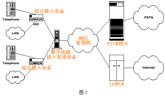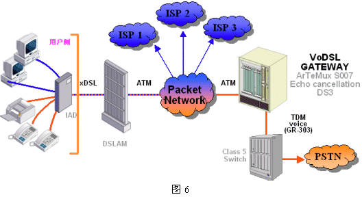 這種方式又稱為VoMBN/VoMSBN(Voice over Multi-service Broadband Network)。圖5給出了MSDN的邏輯結(jié)構(gòu)這種方式下,DSL本地環(huán)路和PSTN及Internet間的互聯(lián)不再通過Class 5交換機,而由地區(qū)寬帶多業(yè)務(wù)網(wǎng)絡(luò)代替,從用戶側(cè)看仍和Class 5 交換機等效,當(dāng)其功能復(fù)雜得多。這個網(wǎng)絡(luò)可以是基于IP或ATM的,它包含信令系統(tǒng)和呼叫處理服務(wù)器及各種網(wǎng)關(guān)設(shè)備。