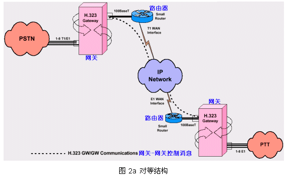 從PSTN來(lái)的呼叫被H.323網(wǎng)關(guān)受理,把其中的話音流轉(zhuǎn)換成IP數(shù)據(jù)包經(jīng)過(guò)IP網(wǎng)絡(luò)傳到目的網(wǎng)關(guān)下的指定電話終端;同時(shí)受理IP網(wǎng)絡(luò)來(lái)的呼叫(可以來(lái)自電腦終端或另一個(gè)PTT網(wǎng)絡(luò))轉(zhuǎn)向PSTN目的終端1。
