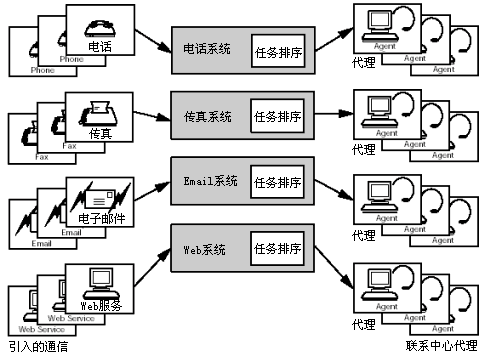 對(duì)通信媒體多樣性的支持是非常重要的,其中通信媒體包括電話、交互語音應(yīng)答、email、Web業(yè)務(wù)、傳真以及文件處理。為了處理通信媒體的多樣性,系統(tǒng)可能被分成多個(gè)子系統(tǒng),每個(gè)子系統(tǒng)對(duì)應(yīng)一種媒體類型。子系統(tǒng)將輸入的通信信息通知給負(fù)載序列,并且一直保留該通信信息,直到收到負(fù)載序列準(zhǔn)備路由該通信信息的消息。然后子系統(tǒng)按照負(fù)載序列的指令將通信信息發(fā)送到正確的代理坐席或設(shè)備。