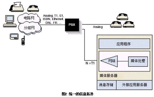 圖2是有前提的典型統(tǒng)一消息拓?fù)鋱D。這個(gè)例子中媒體服務(wù)器管理消息的存儲(chǔ)和提取,這些消息包括語(yǔ)音、傳真、數(shù)據(jù)或視頻。它可以訪(fǎng)問(wèn)不同媒體文件以及必要的控制規(guī)則以實(shí)現(xiàn)各類(lèi)媒體業(yè)務(wù)。可以在本地的媒體服務(wù)器上也可以在遠(yuǎn)程的集中存儲(chǔ)系統(tǒng)上進(jìn)行存儲(chǔ)。在這種情況下,能提供語(yǔ)音和傳真資源的統(tǒng)一的消息系統(tǒng)通常和email系統(tǒng)比如微軟的Microsoft