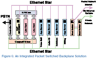 PICMG 2.16兼容平臺上,這種解決方案充分利用了有背板結(jié)構(gòu)的以太網(wǎng)交換的集成特性,以提供任意插槽(節(jié)點(diǎn))和以太網(wǎng)交換插槽兩者之間的物理連接。有著特定的串行卡,可能是語音處理卡,SDSL集中器,或一塊VoIP網(wǎng)關(guān)卡,通過使用在這些卡上的CompactPCI控制平面和H.110數(shù)據(jù)平面得以實(shí)現(xiàn)。(為了清晰,額外的不被使用的CompactPCI總線部分,和相關(guān)的H.110總線部分,在圖6中忽略)
