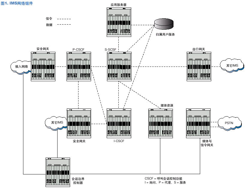 為獲得上述優(yōu)勢,IMS主要使用了如下組件:歸屬用戶服務(wù)、呼叫會話控制功能、安全網(wǎng)關(guān)、IP媒體服務(wù)器、及應(yīng)用服務(wù)器。圖1是這些組件及其它IMS網(wǎng)絡(luò)組件的圖解。