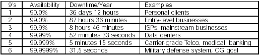 正如表中建議的那樣,實用性尤其在非常接近1的區(qū)間內(nèi)才被討論。盡管99%的正常運行時間看起來很好,它仍然將導(dǎo)致每年超過3天半的故障時間。大部分方案不會被認為是高可用的,直到它們接近99.9%的運行時間--大概每年9個小時的故障時間。但是,通信行業(yè)使用4個9級別到5個9級別范圍的實用性。