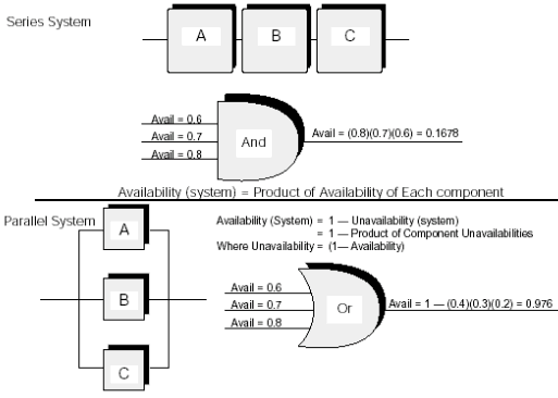由于冗余被引入系統(tǒng),系統(tǒng)的可用特性發(fā)生了重大的改變。實用性計算變成了一種費力并且容易出錯的工作,因為計算必須考慮冗余的效果,失效切換到冗余組件的成功率,MTTR失效組件的效率及相似的問題。使用平臺和電話板塊MTTF數(shù)據(jù)作為輸入和使用可靠模塊圖(RBD)2以正確決定系統(tǒng)級別可用特性可以獲得更好的結(jié)果。
