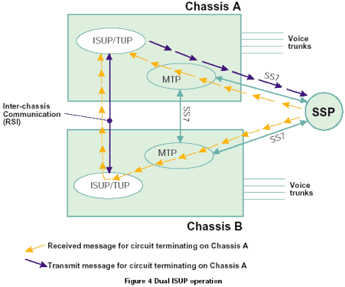 一個(gè)雙ISUP/TUP系統(tǒng)通過(guò)激活每個(gè)機(jī)箱中的一半電路協(xié)議狀態(tài)機(jī)進(jìn)行工作。每個(gè)ISUP/TUP層通過(guò)本地MTP3發(fā)送所有的傳送業(yè)務(wù)。本地MTP3采用與相鄰SS7節(jié)點(diǎn)之間的本地鏈路進(jìn)行傳輸,如果該鏈路發(fā)生故障,采用機(jī)箱之間的SS7連接。