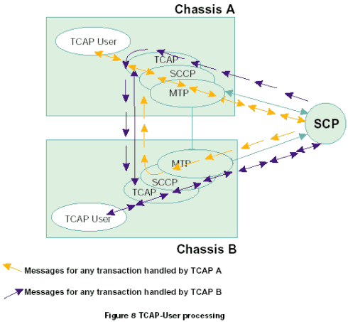 每個(gè)TCAP將所有接收的信息傳遞到同機(jī)箱中的TCAP用戶任務(wù)中,根據(jù)每一個(gè)TCAP中不同的應(yīng)用層或用戶,將TCAP層的應(yīng)用程序發(fā)送的傳送會(huì)話和組件原語(yǔ)傳遞給正確的TCAP。在一個(gè)雙系統(tǒng)環(huán)境中,接收的消息可以在任何MTP和SCCP層上共享。因此,一個(gè)TCAP層接收由其他TCAP處理的應(yīng)用在激活事務(wù)上的TCAP消息是可能的。