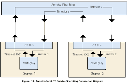為了能夠共享時隙,將本地服務器上的CT總線連接到Amtelco光纖環(huán)路,然后從光纖環(huán)路連接到另外一個服務器的本地CT總線。圖11是一個簡單圖示,顯示了一個服務器1上的中間設(shè)備(dxxxBxCx)到另外一個服務器2上的中間設(shè)備(dxxxBxCx)的連接。