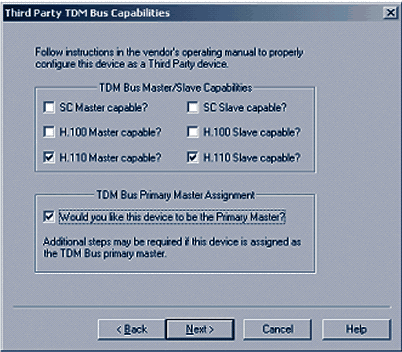 現(xiàn)在需要選擇合適的TDM總線的功能,對合適的類型(對于PCI,選擇H.100,對于CompactPCI,選擇H.110),您需要選擇主選項和客戶端選項。如果該設(shè)備將要為CT總線(客戶端服務器)提供主時鐘,選中TDM總線主控制選項,然后單擊下一步。圖5顯示的是CompactPCI服務器在系統(tǒng)中配置為客戶端服務器的選擇。