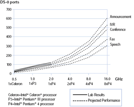 在奔騰處理器上引入DSP能力使得開發(fā)主機(jī)媒體處理功能非常高性價比. 根據(jù)初步的預(yù)測, Dialogic估計(jì)HMP軟件讓一個1GHz的奔騰處理器可以代替兩顆150MHz的DSP.