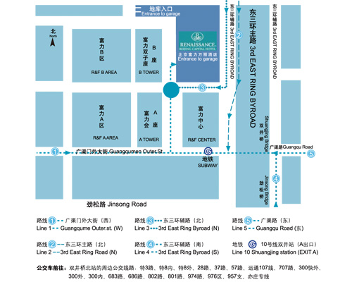 場(chǎng)館交通信息 名 稱(chēng):北京富力萬(wàn)麗酒店 Renaissance Beijing Capital Hotel 公 交:特3路/特8外環(huán)主路/特8快車(chē)內(nèi)環(huán)/特8內(nèi)環(huán)主路/特8快車(chē)外環(huán)/特8外環(huán)/特8內(nèi)環(huán)/28路/7區(qū)間(高峰車(chē))/37路/57路/運(yùn)通107線/214夜班/300內(nèi)環(huán) 300快車(chē)內(nèi)環(huán)/300快車(chē)外環(huán)/300外環(huán)/348路/683路/686路/707路/801路/802路/974路/976區(qū)間 雙井橋北站下車(chē) 地 鐵:10號(hào)線雙井站下