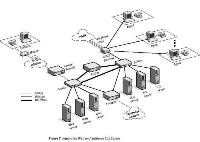 向基于軟件的呼叫中心模型遷移的第一步:通過(guò)使呼叫中心具有Web能力,將來(lái)自因特網(wǎng)的呼叫接入到現(xiàn)有呼叫中心中。圖5展示了H.323網(wǎng)關(guān)如何轉(zhuǎn)換VoIP呼叫到現(xiàn)有自動(dòng)呼叫分配器(ACD)支持的傳統(tǒng)電話呼叫。這一簡(jiǎn)單步驟,使公司能夠通過(guò)基于因特網(wǎng)的電話連接客戶。然而,在客戶所見(jiàn)到的Web頁(yè)面和業(yè)務(wù)代表的Web內(nèi)容及CTI數(shù)據(jù)之間,通常既沒(méi)有邏輯連接,也沒(méi)有物理連接。(CTI數(shù)據(jù)的獲得可能會(huì)通過(guò)在客戶的瀏覽器上下載一個(gè)代理或一個(gè)JAVA小程序?qū)崿F(xiàn),通過(guò)它發(fā)出客戶的位置等相關(guān)數(shù)據(jù))。因此在大多數(shù)情況下,客戶和業(yè)務(wù)代表在購(gòu)買(mǎi)或支持過(guò)程中通過(guò)交談而解決問(wèn)題。
